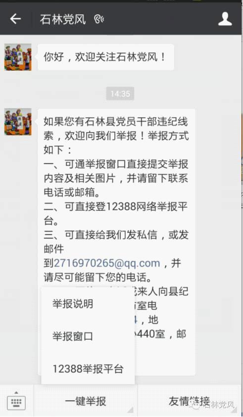 10月14日,石林县纪委微信公众号“石林党风”开通运行,在宣传党纪党规,传递石林纪检监察工作动态的同时,开设了多个举报窗口,接受群众举报。