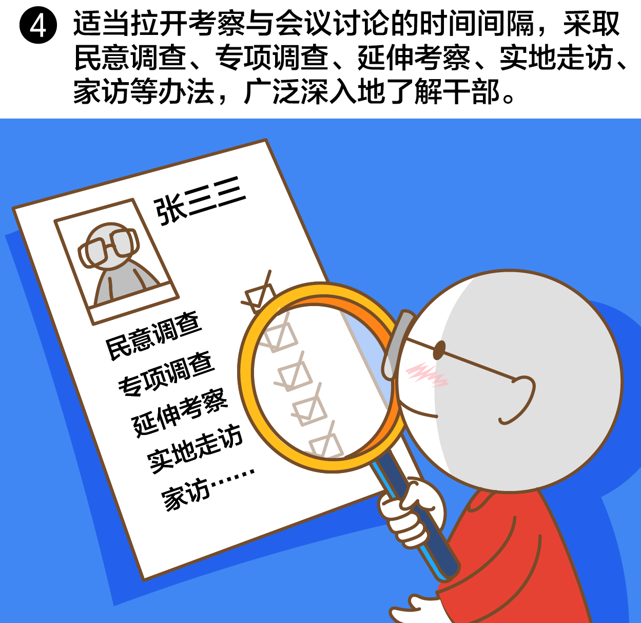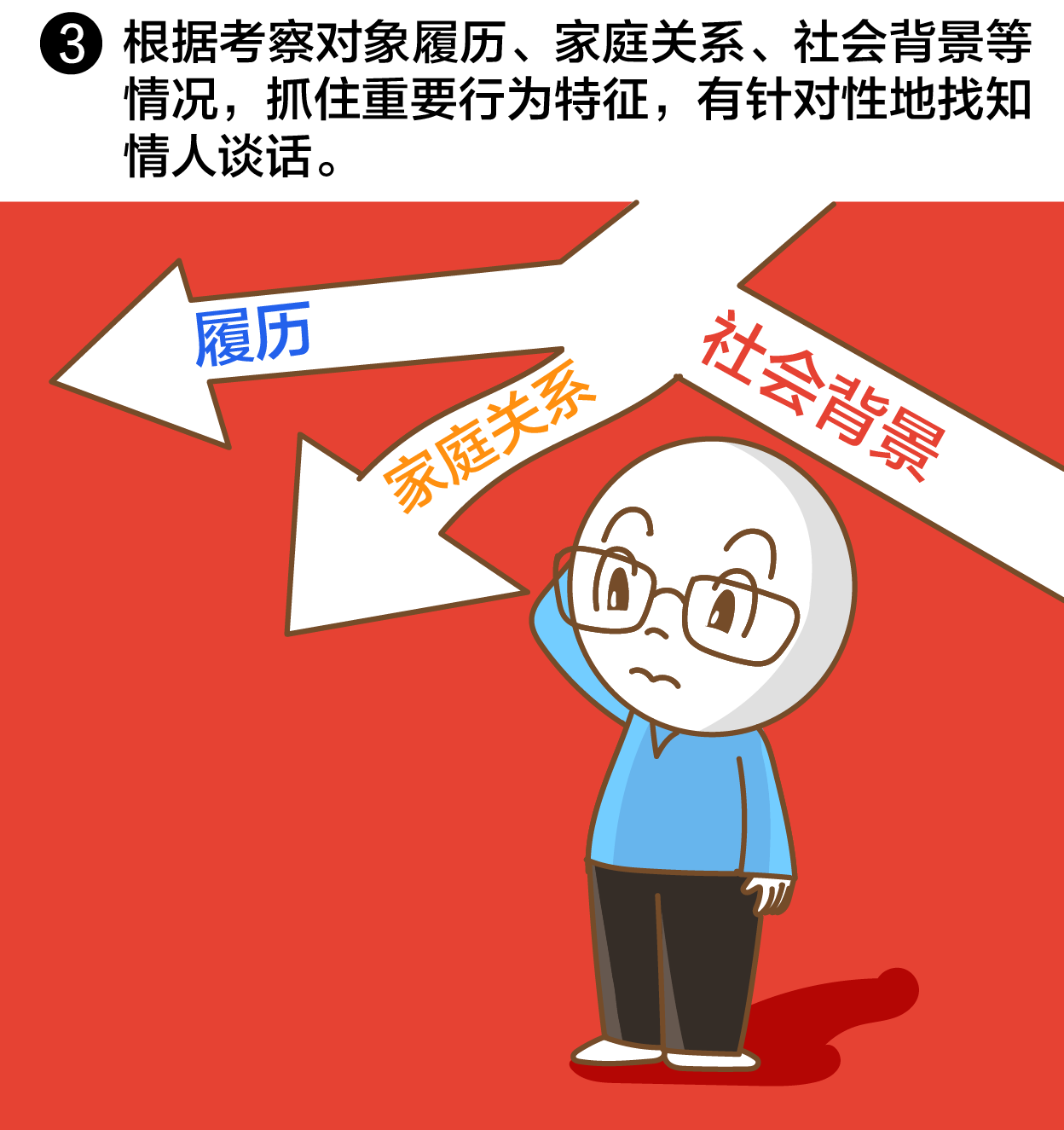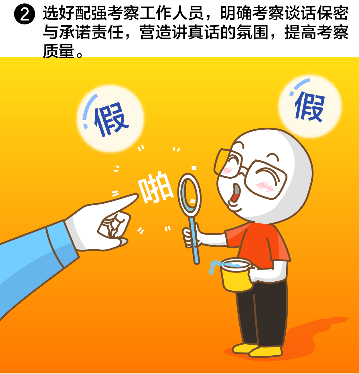 强化任前把关。考察工作要突出针对性、增强灵活性、提高有效性,针对不同考察对象的具体情况,细化考察内容,改进考察方式,力争考察结果全面、客观、准确。选好配强考察工作人员,明确考察谈话保密与承诺责任,营造讲真话的氛围,提高考察质量。根据考察对象履历、家庭关系、社会背景等情况,抓住重要行为特征,有针对性地找知情人谈话。适当拉开考察与会议讨论的时间间隔,采取民意调查、专项调查、延伸考察、实地走访、家访等办法,广泛深入地了解干部。改进考察对象公示和任职前公示方式,探索扩大公示内容、范围和延长公示时间,充分接受干部群众监督。强化审核措施,做到干部档案“凡提必审”,个人有关事项报告“凡提必核”,纪检监察机关意见“凡提必听”,反映违规违纪问题线索具体、有可查性的信访举报“凡提必查”。前移审核关口,做到动议即审,该核早核。对发现问题影响使用的,及时中止选拔任用程序;疑点没有排除、问题没有查清的,不得提交会议讨论或任用。对一时存疑、暂未使用的干部,要本着高度负责的态度,及时查清问题、作出结论,为那些受到诬告、诽谤、陷害的干部澄清正名,严肃处理打击报复、诬告陷害行为。坚持事业为上、公道正派,保护作风过硬、敢作敢为、锐意进取的干部,对那些想干事、能干事、敢担当、善作为的干部要旗帜鲜明地撑腰鼓劲、大胆使用。(摘自《关于防止干部“带病提拔”的意见》)(中央纪委监察部网站 王婵 王洁)