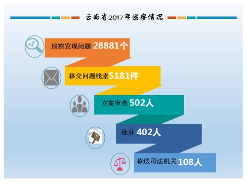 云南省巡察工作坚持问题导向,各州市、县(市)区党委制定出巡察规划,完善巡察措施,深入基层一线,对被巡察党组织进行全面“体检”,精准发现问题。2017年,全省通过巡察发现“三大问题”19980个、“六项纪律”问题8901个。巡察期间,共向被巡察党组织提出需立行立改问题2977条,已整改2872条,向州市、县(市)区党委提交专题报告578份,提出意见建议15650条,根据巡察发现的共性、倾向性问题建立健全4079项制度;移交问题线索5181件,立案502人,处分402人,移送司法机关108人。