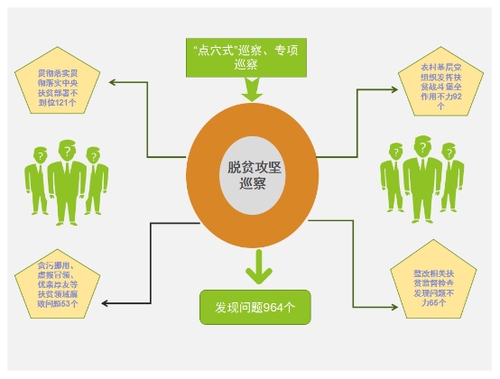 云南省将扶贫领域作为巡察重点,紧盯扶贫领域贪污侵占、吃拿卡要、优亲厚友、截留挪用等违纪问题,以“点穴式”巡察、专项巡察等方式对脱贫攻坚情况开展监督检查。通过巡察发现扶贫领域各类问题964个,其中贯彻落实中央扶贫部署不到位问题121个,农村基层党组织发挥扶贫战斗堡垒作用不力问题92个,整改相关扶贫监督检查发现问题不力65个,贪污挪用、虚报冒领、优亲厚友等扶贫领域腐败问题53个。(云南省纪委)