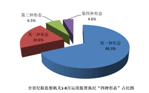 为达到管护好整片“森林”的目的,全省纪检监察机关坚持将纪律挺在前面,惩前毖后、治病救人,使广大党员干部知敬畏、存戒惧、守底线。前8月,全省纪检监察机关共处置问题线索12304件,运用监督执纪“四种形态”处理14189人次,其中,第一种形态9691人次,占“四种形态”处理总人次的68.3%;第二种形态2929人次,占20.6%;第三种形态917人次,占6.5%;第四种形态652人次,占4.6%。