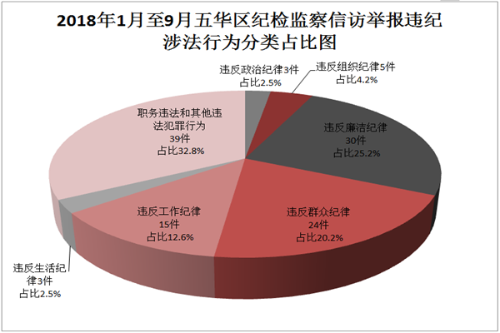 从检举控告类初信初访中违纪涉法行为来看,违反政治纪律总量3件,占2.5%;违反组织纪律总量5件,占4.2%;违反廉洁纪律总量30件,占25.2%;违反群众纪律总量24件,占20.2%;违反工作纪律总量15件,占12.6%;违反生活纪律总量3件,占2.5%;职务违法和其他违法犯罪行为总量39件,占32.8%。(付明永 王舒银)