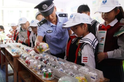 禁毒宣传进校园,让毒品远离青春!昆明市五华区禁毒办民警帮助同学们远离伪装成“跳跳糖”“橙汁”冲剂的新型毒品。(王泽郁 摄)