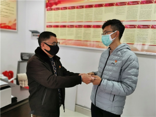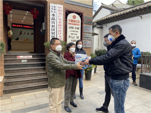 两位退役军人向华山街道办事处捐赠500个医用口罩,为疫情防控加油助力。(赵丽美 摄)