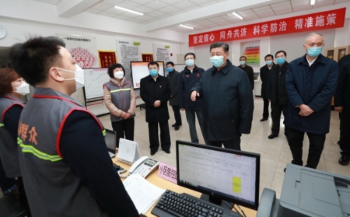 2月10日,中共中央总书记、国家主席、中央军委主席习近平在北京调研指导新冠肺炎疫情防控工作。这是习近平在朝阳区安贞街道安华里社区,了解基层一线疫情联防联控情况。(庞兴雷 摄)