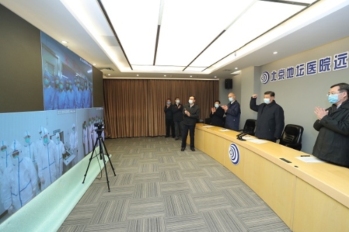 自今年1月12日起,首都医科大学附属北京地坛医院开始承担新冠肺炎患者的救治、筛查、隔离工作,收治了北京市第一例确诊病例。习近平来到地坛医院门诊楼一层运行监控中心,通过监控画面察看患者住院诊疗情况,并视频连线正在病房值班的医务人员,鼓励他们继续完善诊疗方案,继续全力以赴救治患者,努力提高收治率和治愈率、降低感染率和病亡率,并叮嘱他们做好自我防护。