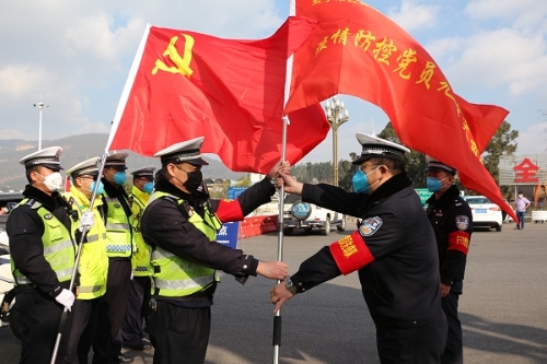 为打赢抗疫战争,安宁市交警大队党员民警接到命令迅速下沉到疫情防控第一线,勠力同心为人民群众筑起平安防线,让党旗飘扬在抗疫战线之上!(杨丽 摄)
