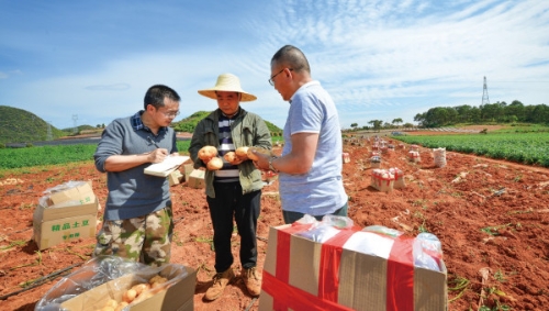 云南省砚山县纪检监察机关认真落实脱贫攻坚“四不摘”要求,紧盯惠农政策、产业项目、资金流向强化监督检查,巩固提升脱贫成效。图为县纪委监委干部在平远镇土豆种植基地核实产业扶贫资金落实情况。鲁绍刚 摄