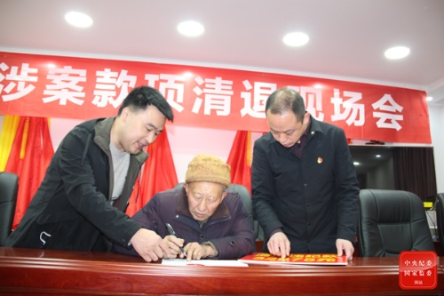 重庆市巫山县纪委监委严肃查处该县竹贤乡卫生院原院长刘某严重违纪违法案件,为达到以案改监管、以案改作风的叠加效应,该县举行涉案款项清退现场会,将涉案款项退还给群众。图为涉案款项清退现场领款人在签字。(重庆市巫山县纪委监委 殷堃 摄)