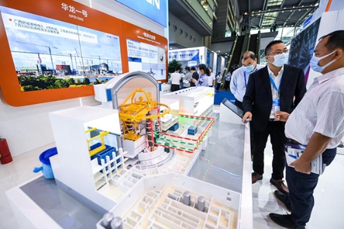 11月11日,在深圳举行的第二十二届中国国际高新技术成果交易会(高交会)上,参观者在中广核展台了解“华龙一号”核电技术。毛思倩 摄