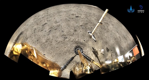 12月4日,国家航天局公布了探月工程嫦娥五号探测器在月球表面国旗展示的照片。嫦娥五号着陆器和上升器组合体全景相机环拍成像,五星红旗在月面成功展开,此外图像上方可见已完成表取采样的机械臂及采样器。新华社发(国家航天局供图)