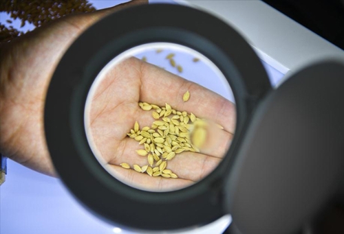 在吉林省吉林市永吉县一拉溪镇九月丰家庭农场,工作人员在实验室中检测一批试种水稻的稻谷外观(8月12日摄)。许畅 摄