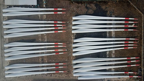 这是河北省威县一家风电设施生产企业内的大型风电机组叶片(12月8日摄,无人机照片)。牟宇 摄