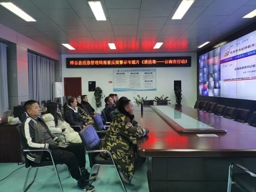 砚山县委党校全体干部职工在值班室一起观看《清流毒——云南在行动》。