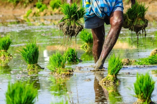 趁时忙插秧,辛劳盼丰收。农民趁芒种时节抓紧时间插秧苗,辛苦的付出孕育着丰收的希望。(车天雪 摄)