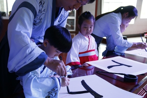 安宁市某中学一位老师正在手把手教学生练习书法,上好传统文化课,让学生从小树立正确的价值观,培养高尚的情操。(贾建荣 摄)
