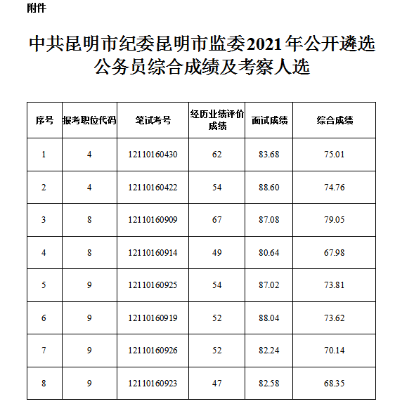 附件: 中共昆明市纪委昆明市监委2021年公开遴选公务员综合成绩及考察人选