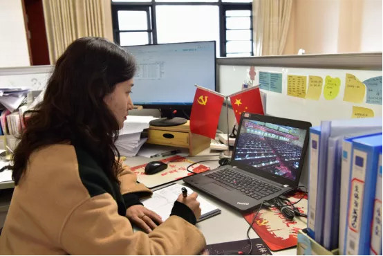 图为石林县纪委监委值班干部利用互联网观看直播,学习省党代会精神。(岂艳 摄)
