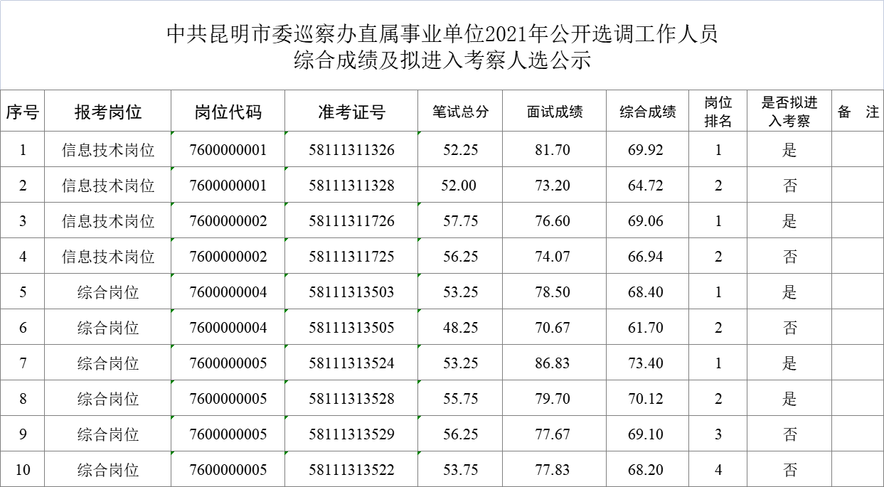 中共昆明市委巡察办直属事业单位2021年公开选调工作人员综合成绩及拟进入考察人选公示