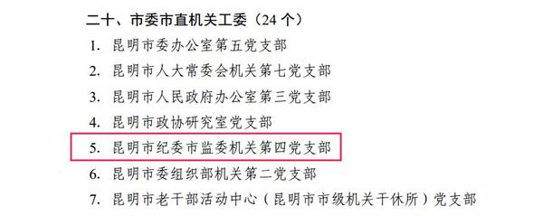 日前,市委组织部命名了一批昆明市2021年度“四星级”“五星级”示范党支部,市纪委市监委机关第四党支部赫然在列,成为“四星级”示范党支部。