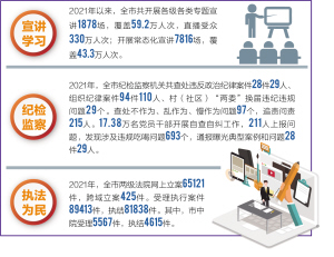 2021年,全市政法机关共推出便民利民各项措施932条,为人民群众提供多样化、多层次、多方面的执法司法服务。