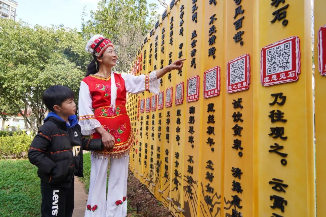 安宁市太平新城街道安化社区打造的党风廉政主题“微”公园吸引居民驻足观看。(聂涵 摄)