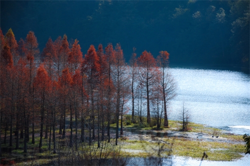 霜染红杉诗入梦,湖映晨光雾朦胧。冬至时节,一棵棵水杉矗立在波光粼粼的湖光中,寂静无声,如梦似幻,仿佛一片秘境森林。(西山区纪委监委陈思思 摄)