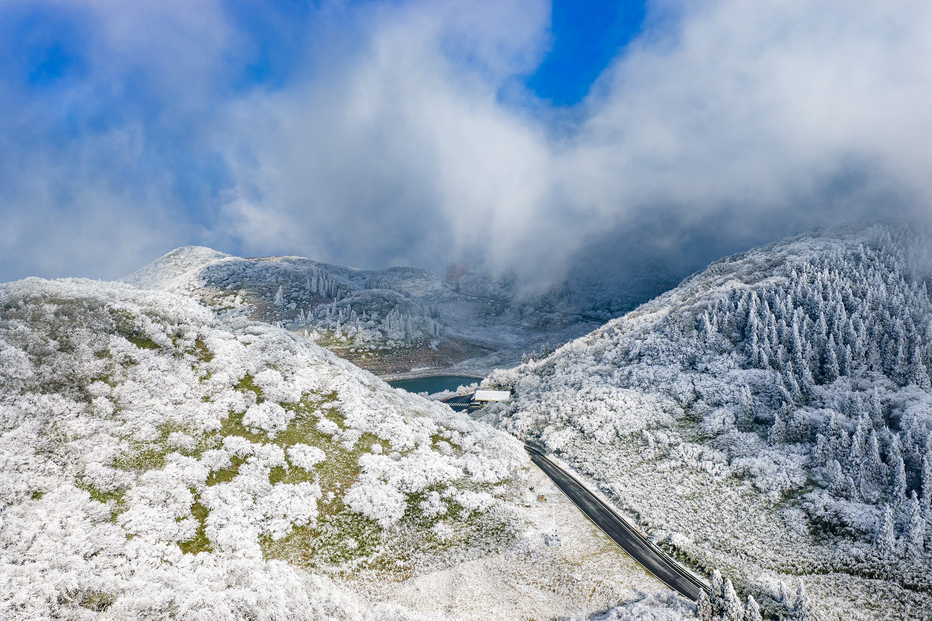 重庆金佛山雪后云海翻涌,雾凇铺满连绵山峦,银装素裹的峰岭半隐于云雾间,宛如冰雪雕琢的仙境画卷。(重庆市南川区纪委监委供 胡波 摄)