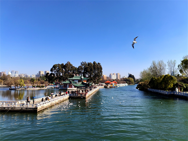 立春至,昆明大观公园已渐显春意,成群的海鸥或盘旋于游人身旁,又或伫立于水面,万物复苏的气息正悄悄弥漫于水天之间,市民们沐浴着暖阳静赏这惬意的春光。(东川区纪委监委 李鹣 摄)