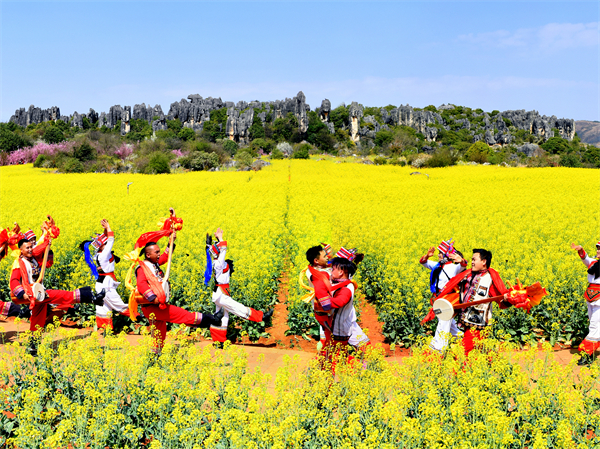 立春至,乃古石林景区中,金黄油菜花海肆意铺展,石林为幕,人们载歌载舞,共赴春日欢歌。(石林县纪委监委 王丽梅 摄)