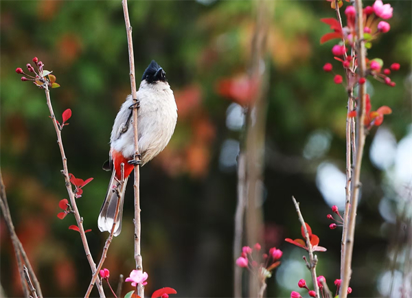 惊蛰初雷唤醒了沉睡的大地,初春的风拂过海棠枝桠,粉白的花苞正攒着劲儿待放。一只白喉红臀鹎栖在细枝上,清亮的啼鸣划破晨雾,仿佛在宣告春天的来临。(昆明市纪委监委 赵艳芳 摄)