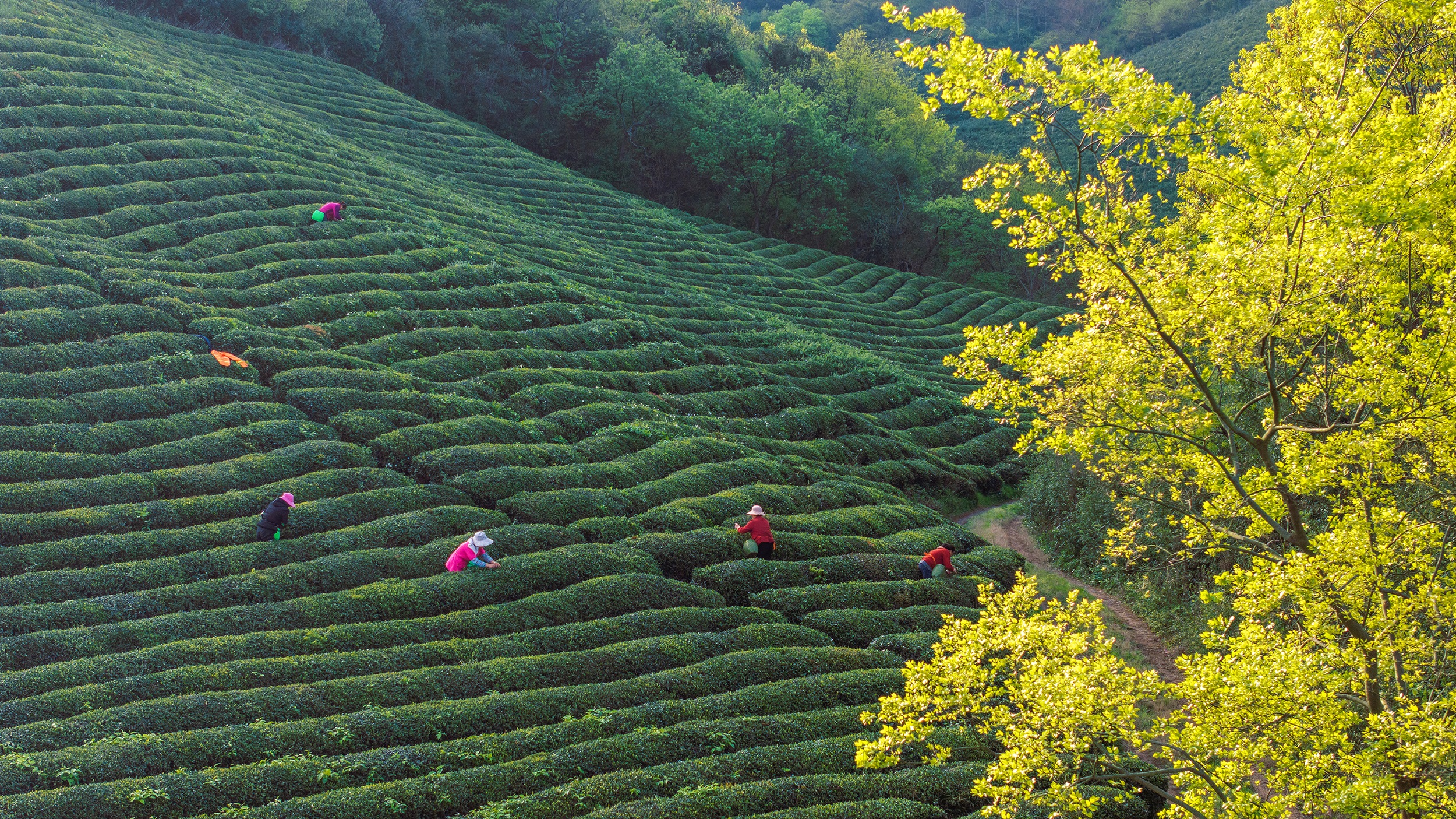 谷雨时节,晨雾缭绕间,茶垄如绿绸铺展,采茶人穿梭其间,指尖轻捻,撷取枝头最鲜嫩的一芽一叶。(安徽省芜湖市湾沚区纪委监委供 李明仙 摄)