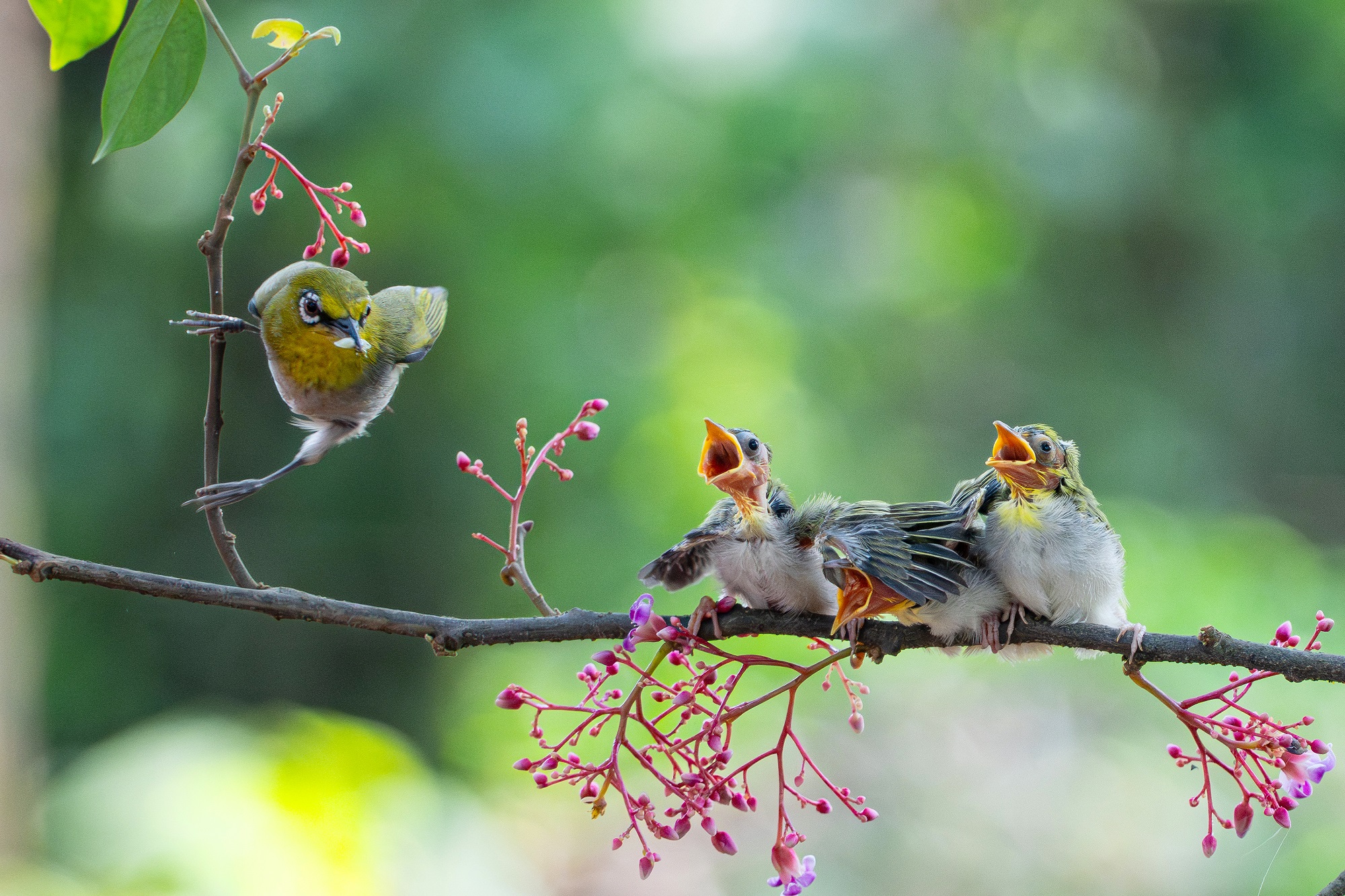 春深四月,生机盎然。绣眼鸟衔食归来,雏鸟仰起嫩红的喙,声声啼鸣里满是期盼。(广西壮族自治区阳朔县纪委监委供 莫志军 摄)