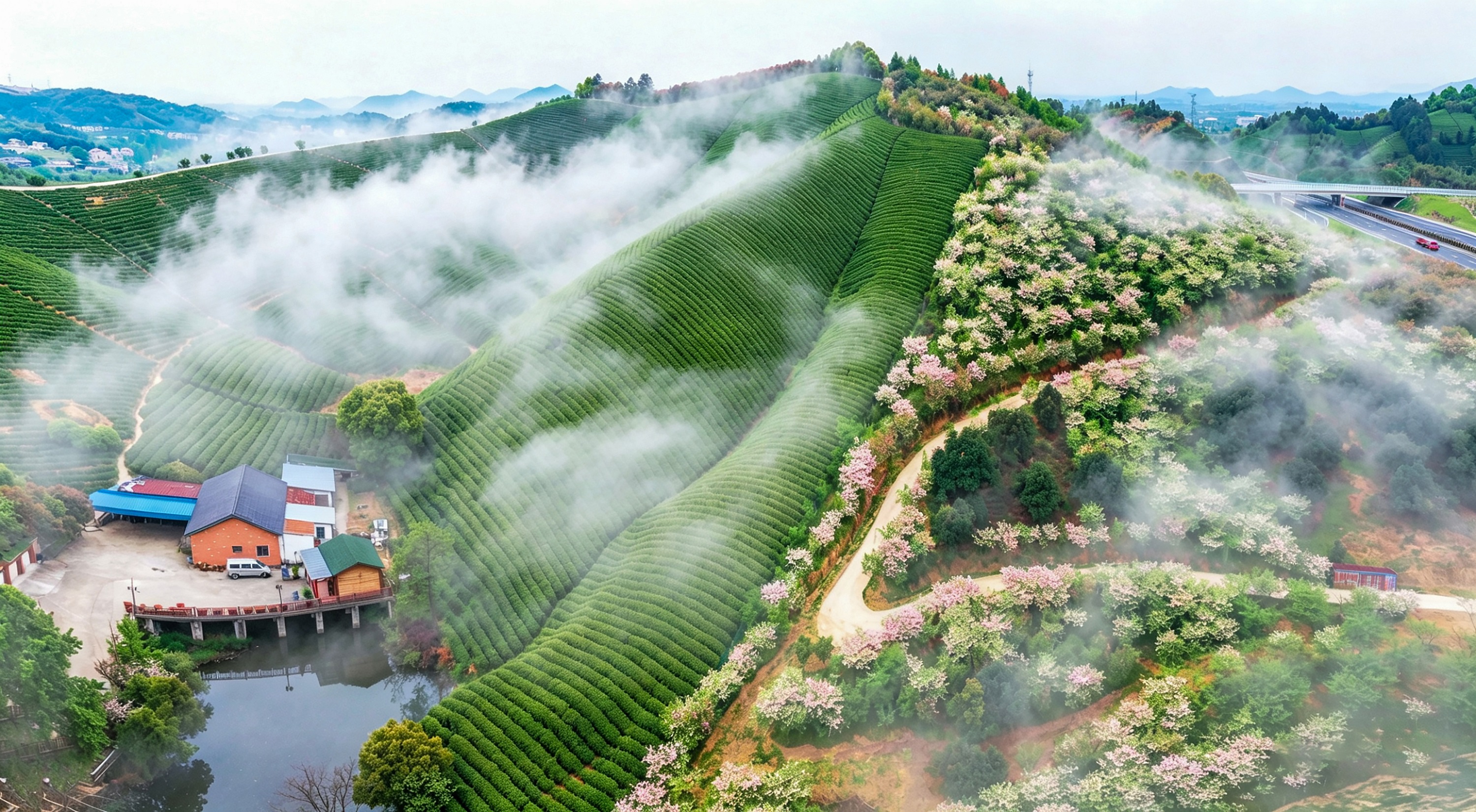 谷雨时节,杭州市径山翠色绵延,茶垄层层如谱,云雾缭绕其间。(杭州市拱墅区纪委监委供 姚建心 摄)