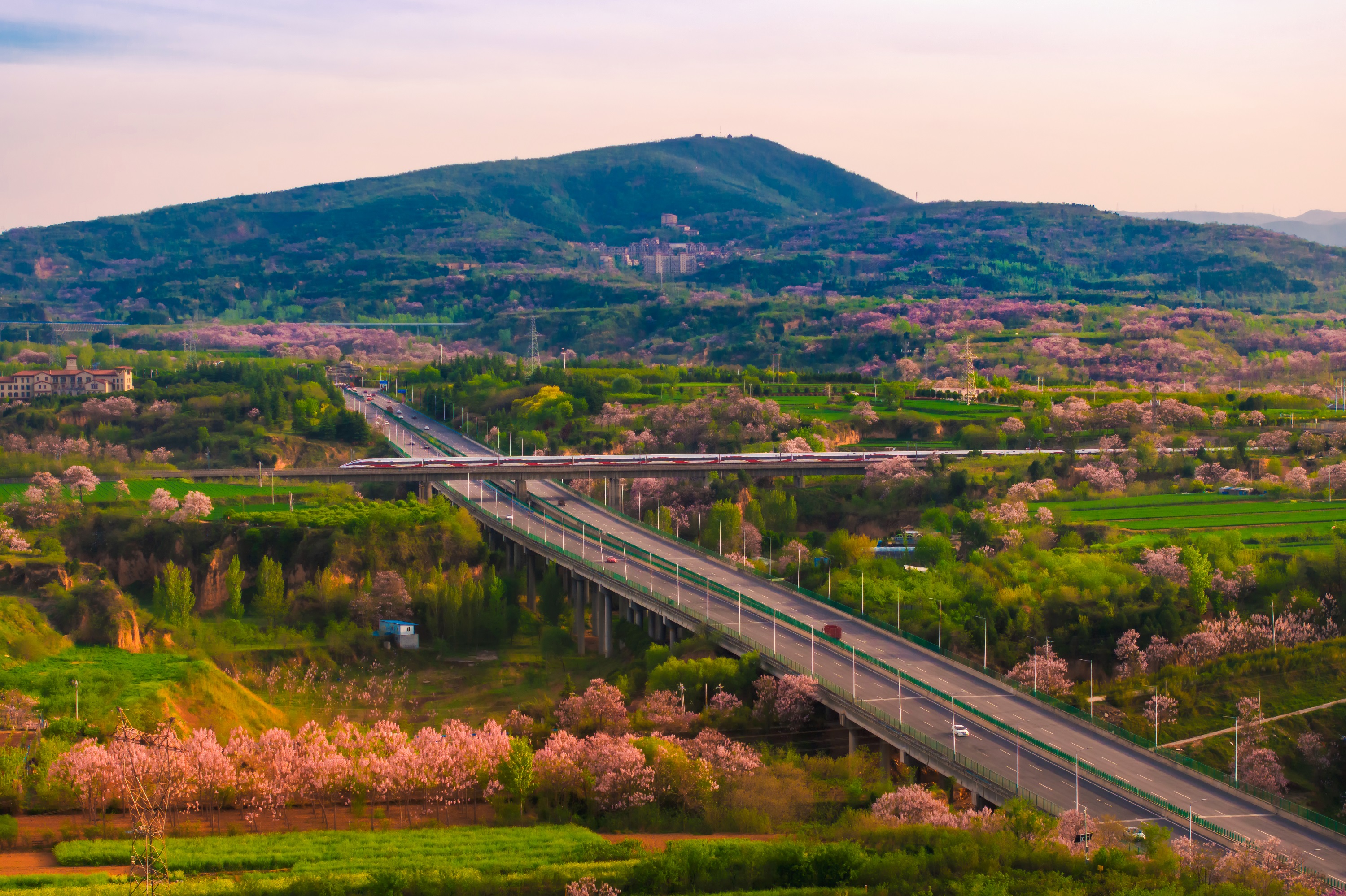 在河南省郑州市上街区,高铁穿行在花海间,公路上车流往来有序,两侧花树盛放、绿意盎然。(河南省郑州市上街区纪委监委供 于海波 摄)