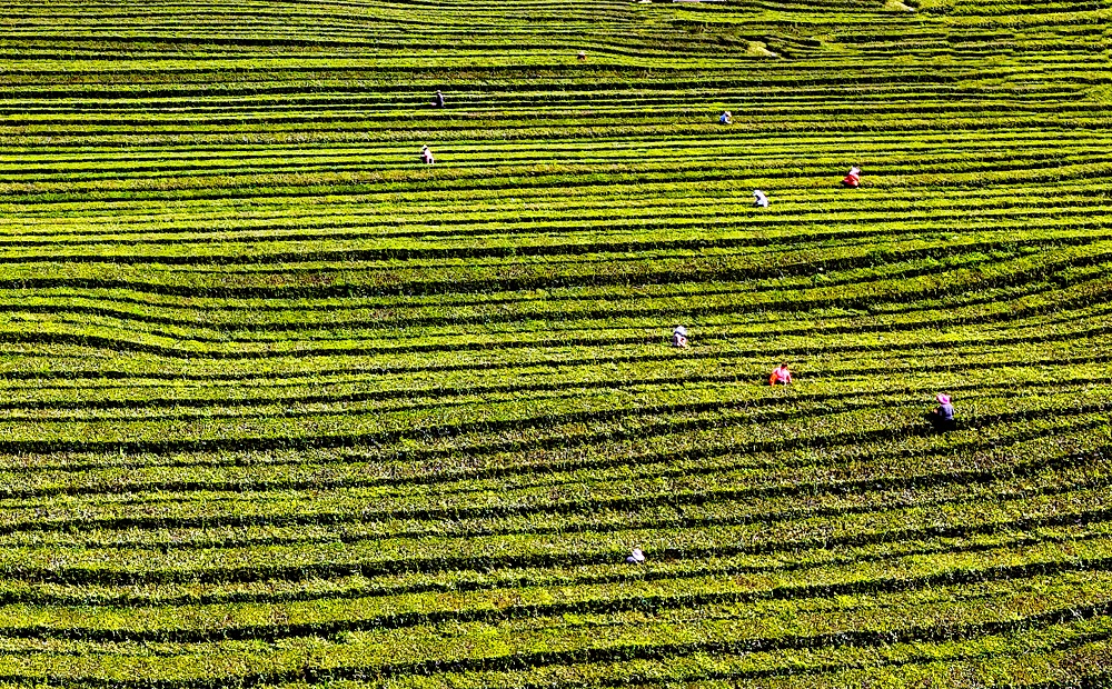 谷雨晴时正摘茶。在贵州省黔南州罗甸县上隆茶场,茶农们抢抓晴好天气采摘谷雨茶。(贵州省黔南州罗甸县纪委监委供 谢再丽 摄)